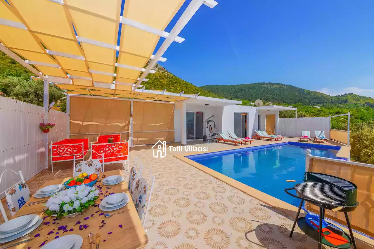 Villa Atlas Kalkan eşsiz bir konumda, muhteşem dağ ve deniz manzaralı huzurlu ortama  sahiptir. Havuz terasımızda ve bahçemizde, salıncak, şezlong, güneşlenme  şemsiyesi, barbekü,  yemek masası ve sandalyeleri, oturma grubu vardır.