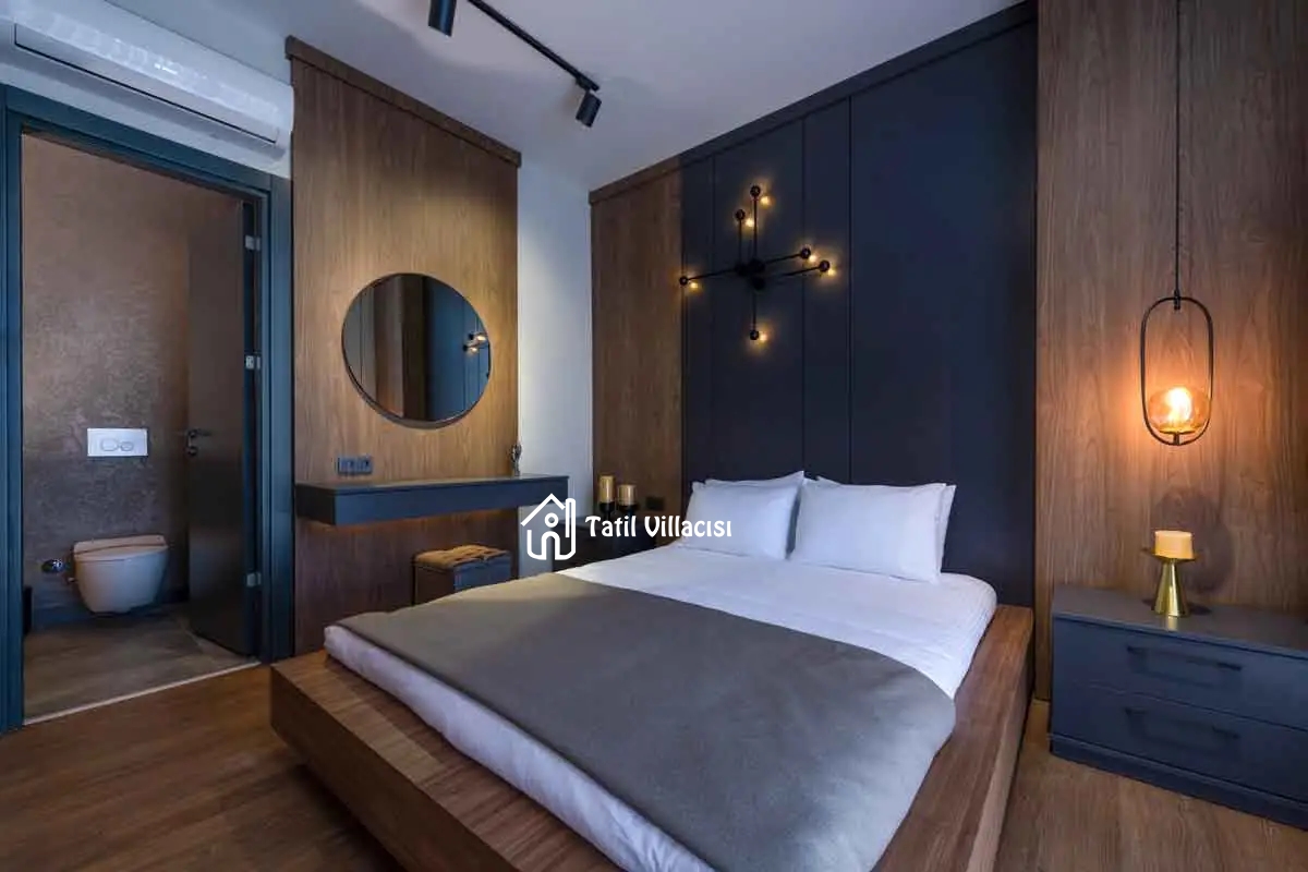 1.Yatak Odası : Bir çift kişilik yatak, komodin, elbise dolabı, klima, ebeveyn banyosu bulunmaktadır.