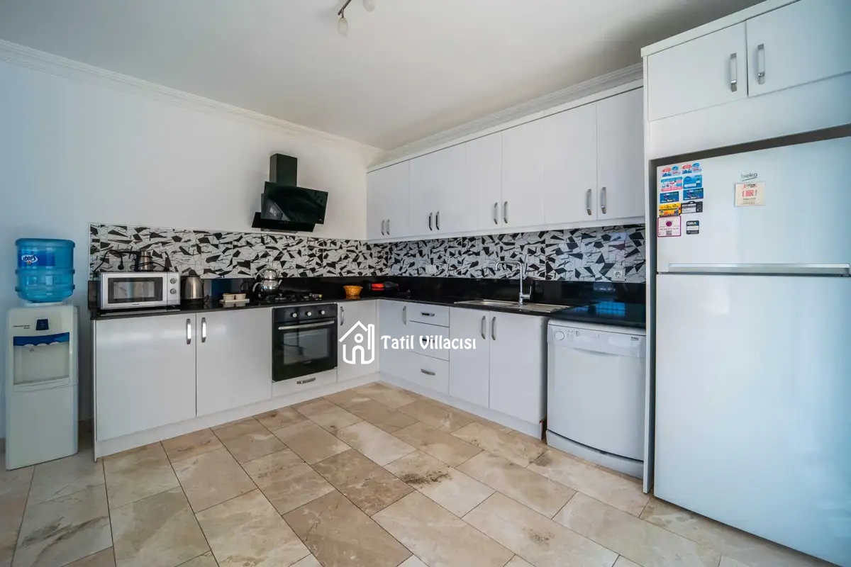 Lüks ve geniş bir mutfağa sahiptir. Buzdolabı, bulaşık makinası, çamaşır makinesi, fırın, 4´lü ocak, kettle, 8 kişilik yemek takımı, tava, tencereler, çatal, bıçak vb.