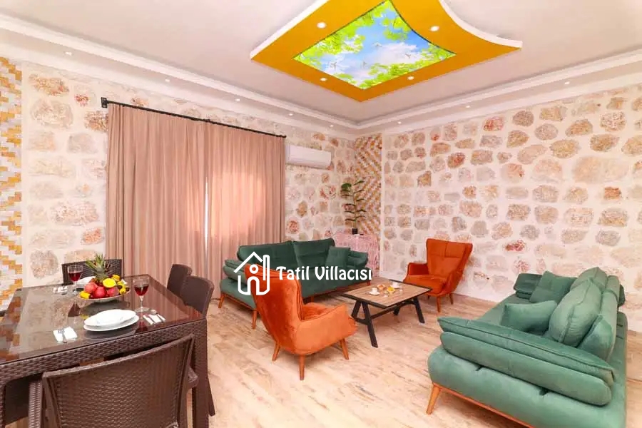 Salonumuzda rahat, kaliteli, oturma gurubu, klima, LCD ve uydu alıcısı, yemek masası ve sandalyeleri bulunmaktadır.