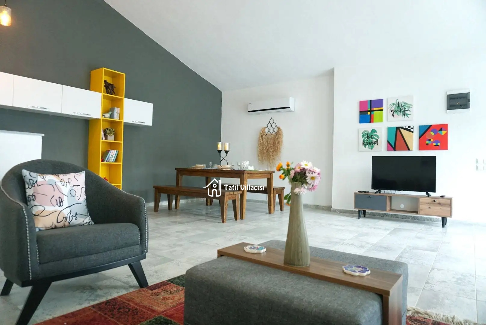 Salonumuzda rahat, kaliteli, oturma gurubu,  LCD ve uydu alıcısı,  havuz başına ve bahçeye çıkış vardır.