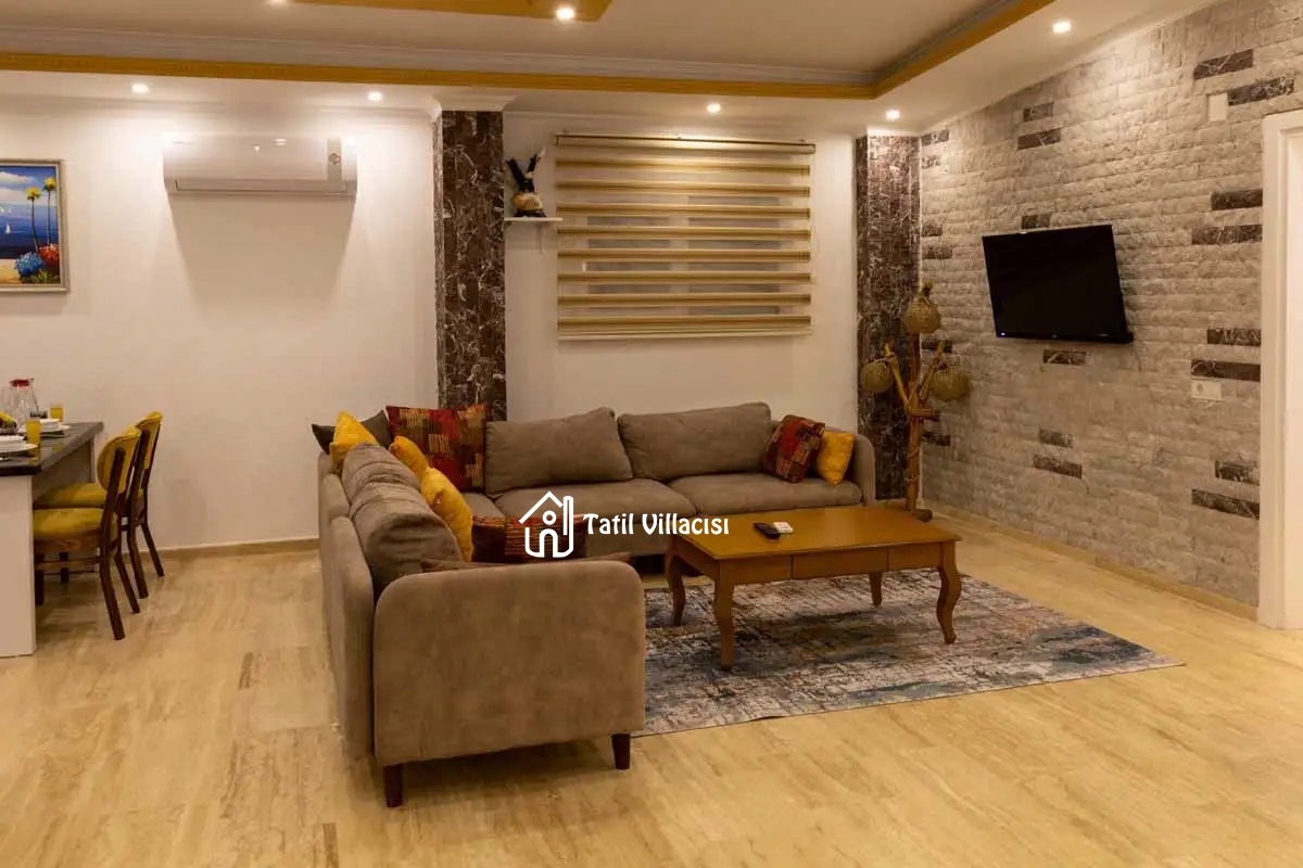Salonumuzda rahat, kaliteli, oturma gurubu,  LCD ve uydu alıcısı,  havuz başına ve bahçeye çıkış vardır.