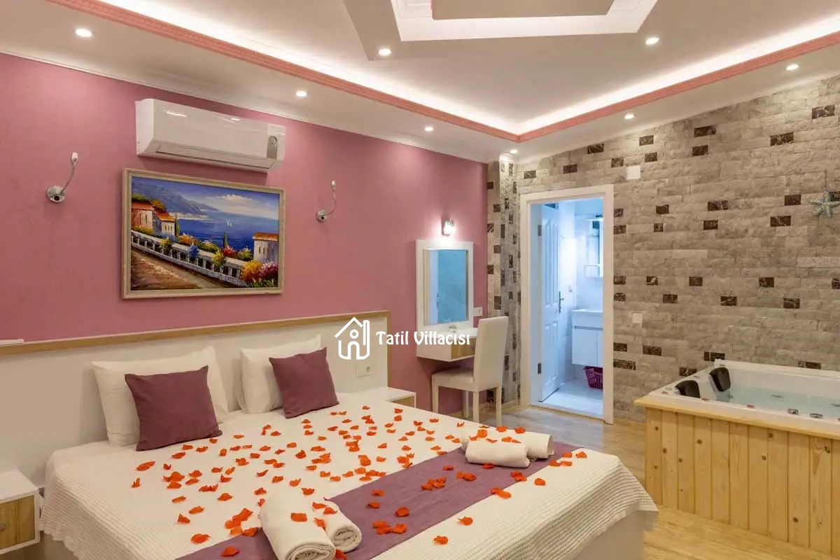 1. Yatak Odası: Bir adet çift kişilik yatak, komodin, elbise dolabı, klima, makyaj masası, ebeveyn banyo-wc si ve jakuzi bulunmaktadır.